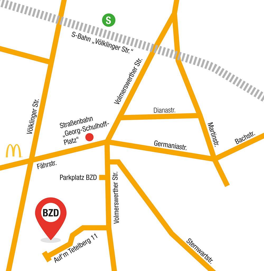 Bahnhaltestellen: Nehmen Sie die Linie S8 oder S11 bis zur Haltestelle „Völklinger Straße“
